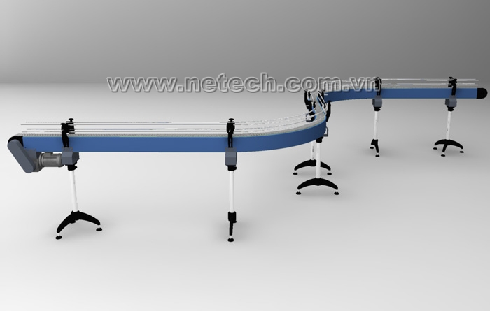 Băng tải xích có thể được uốn cong theo mặt phẳng ngang nên có ưu điểm lớn trong việc bố trí mặt bằng nhà xưởng.